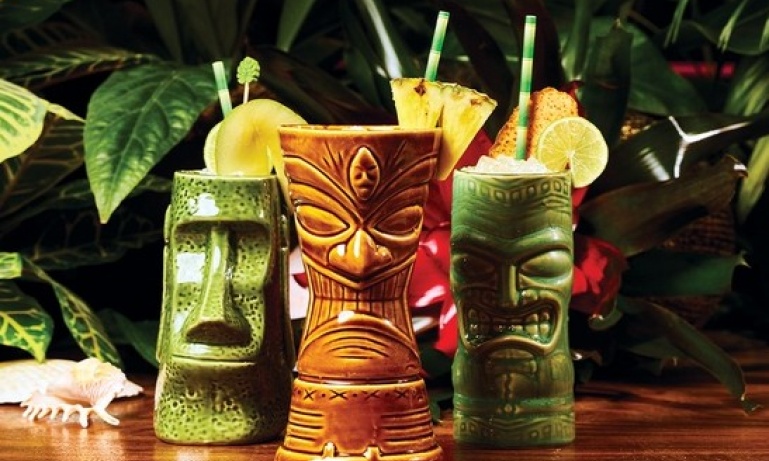 Enter the modern-day, hypnotic world of a Polynesian paradise when you step inside the welcoming Golden Monkey Tiki Lounge. With a towering wall of tiki mugs plus electric green lighting, this place sets a vibe from the start. Enjoy the “Feelin’ Coconutty,’’ which will definitely put you in a tropical mood. Served in a tall tiki mug, this rum and coconut liqueur drink gets a sunny tang from pineapple and passionfruit, not to mention a bold blast of purple color from ube-coconut syrup.
