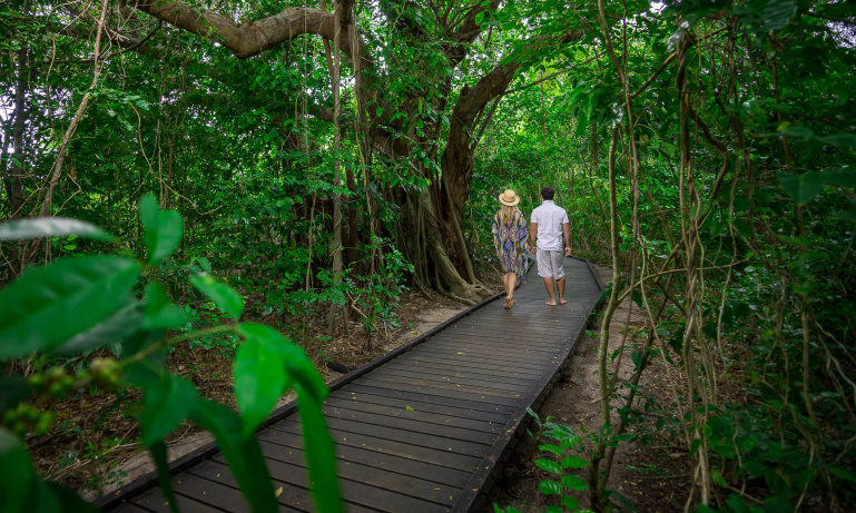 Once you arrive, the day is yours to design. Snorkel vibrant reefs, take a glass-bottom boat tour, or relax by the island’s swimming pool. Feeling curious? Explore the self-guided Eco Island Walk and discover 120 native plant species unique to this tropical paradise.