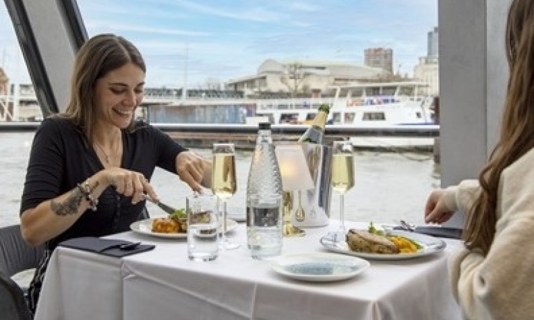 On arrival at Tower Pier, you and your guest will board your river boat at the previously arranged time and commence your 1 hour 45 minute cruise along the River Thames. During this time, soak in panoramic views of London before tucking into a two course lunch, showcasing British flavours and traditions. Then, you and your guest may head up on to the deck for an even better view of the London riverside. Enjoy good company as you take in the great landmarks such as the Shard, the Golden Hinde reconstruction and Sir Francis Drake’s warship. There's also a fully stocked bar on board should you wish to purchase any drinks.